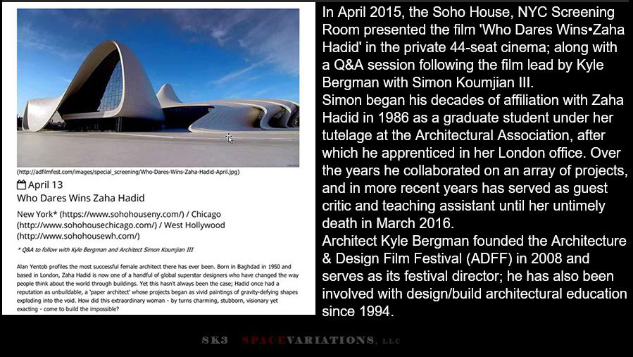 Soho House, NYC screening room in April 2015 presented the BBC documentary film ' Who Dares Wins:Zaha Hadid. Q&A following the screening lead by Kyle Bergman with Simon Koumjian III
