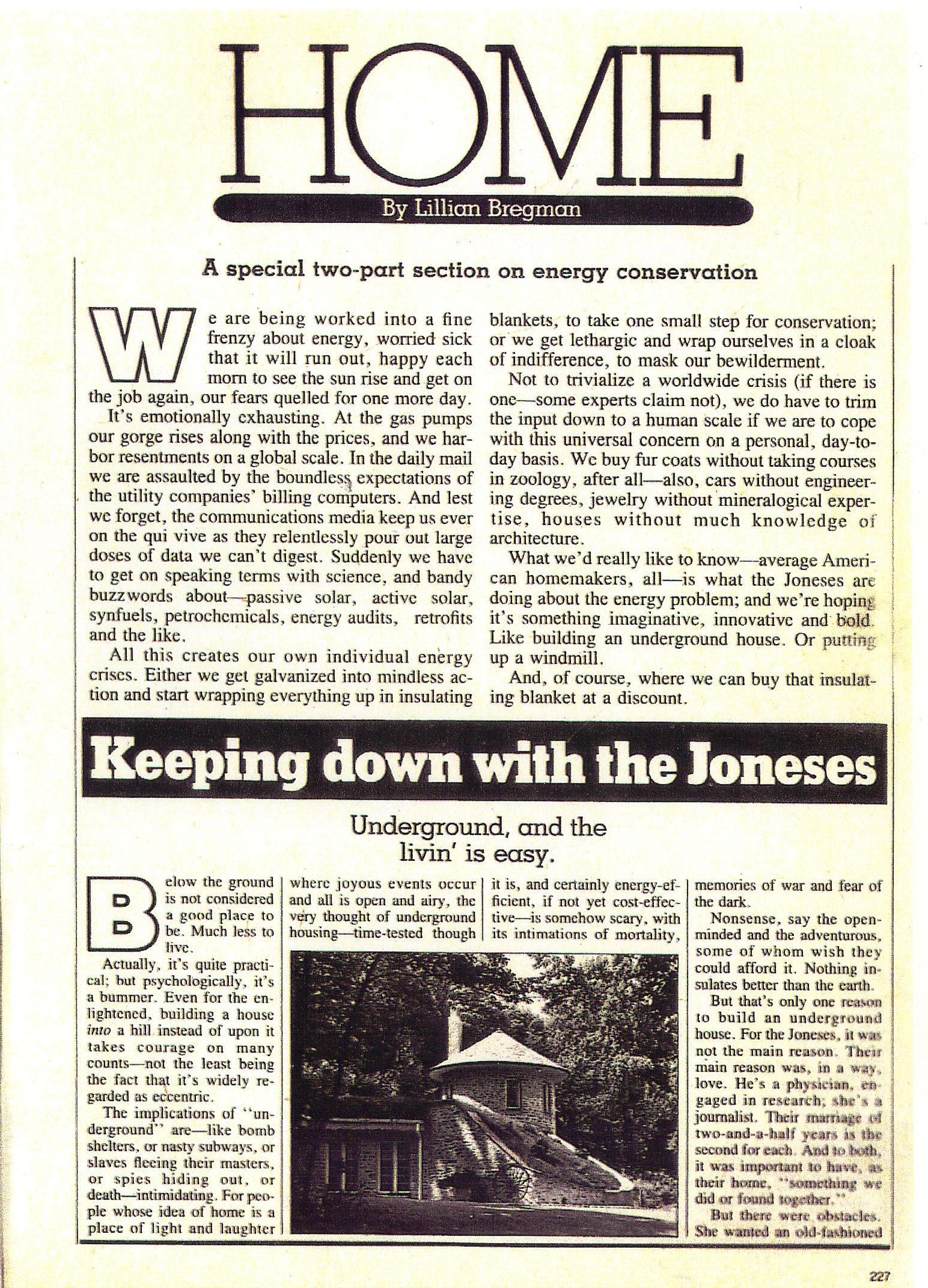 Their first evening in the underground home was New Year’s Eve into 1980 – it represented not only a real symbolic transition in time and place, but to their commitment to energy conservation and greater independence from the utility companies.