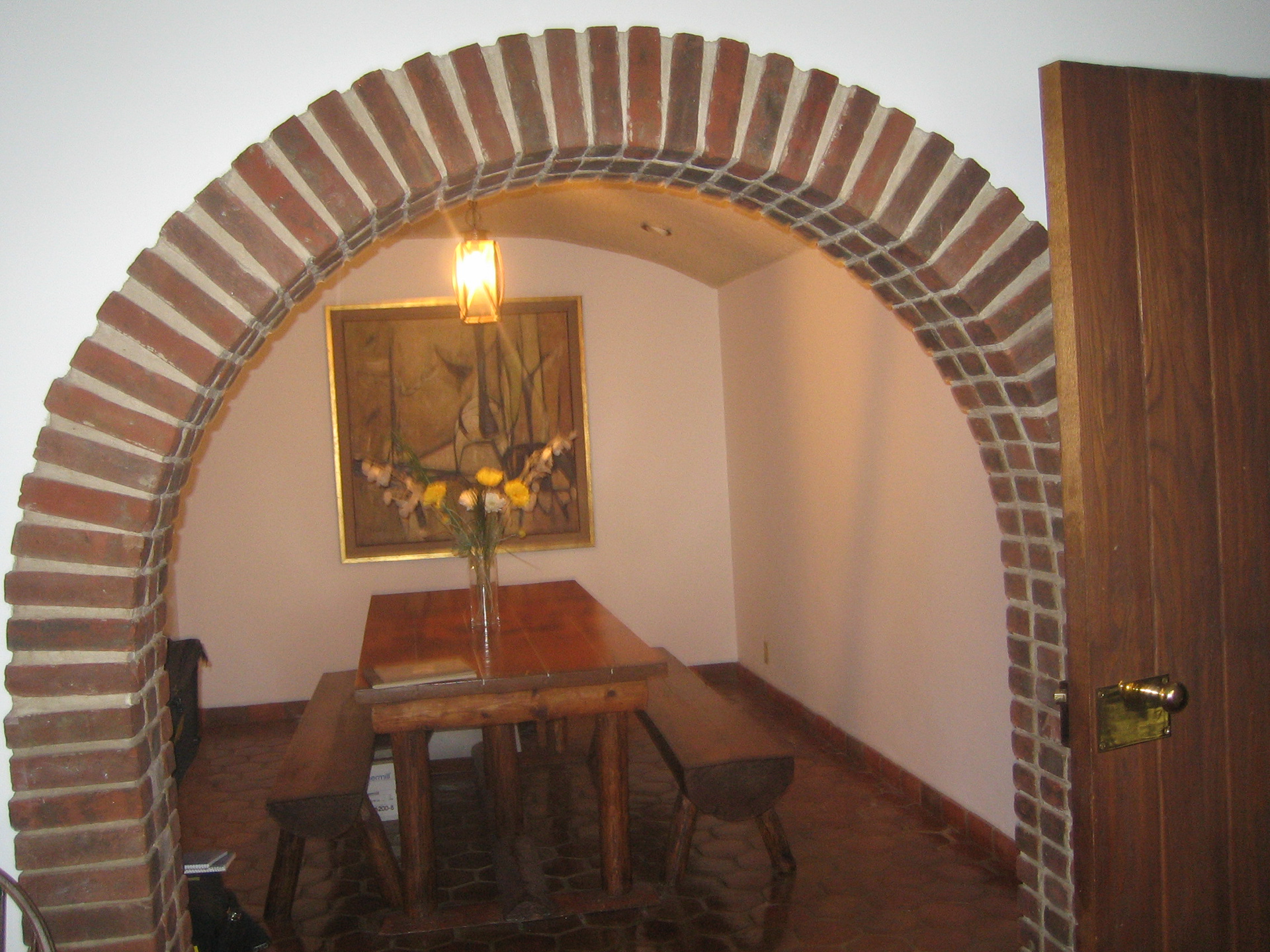 The owner, Dr. Joel Nobel and the founder of ECRI (Emergency Care Research Institute), requested an unusual merger of traditional design elements with contemporary underground construction methods. His wife wanted an 'old-fashioned' traditional house style with lots of natural light. Therefore the entry is designed as a stone tower with a spiral stair leading to a second-floor circular library-writer’s room, which provides 360-degree views of the surrounding landscape vistas and roof garden for Mrs. Nobel, a journalist at the time. The house’s interior spaces are bright with sunlight, complimented by brick arches, plaster walls, and Mexican tile floors- its landscape views from every room give no sense that one inhabits subterranean spaces.